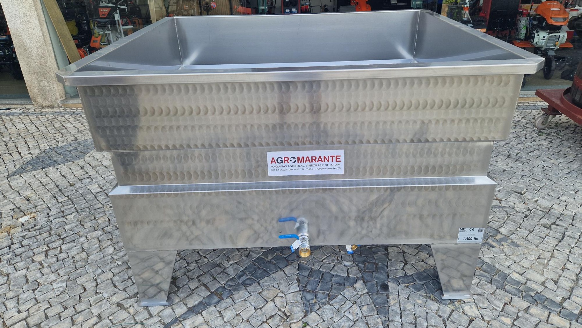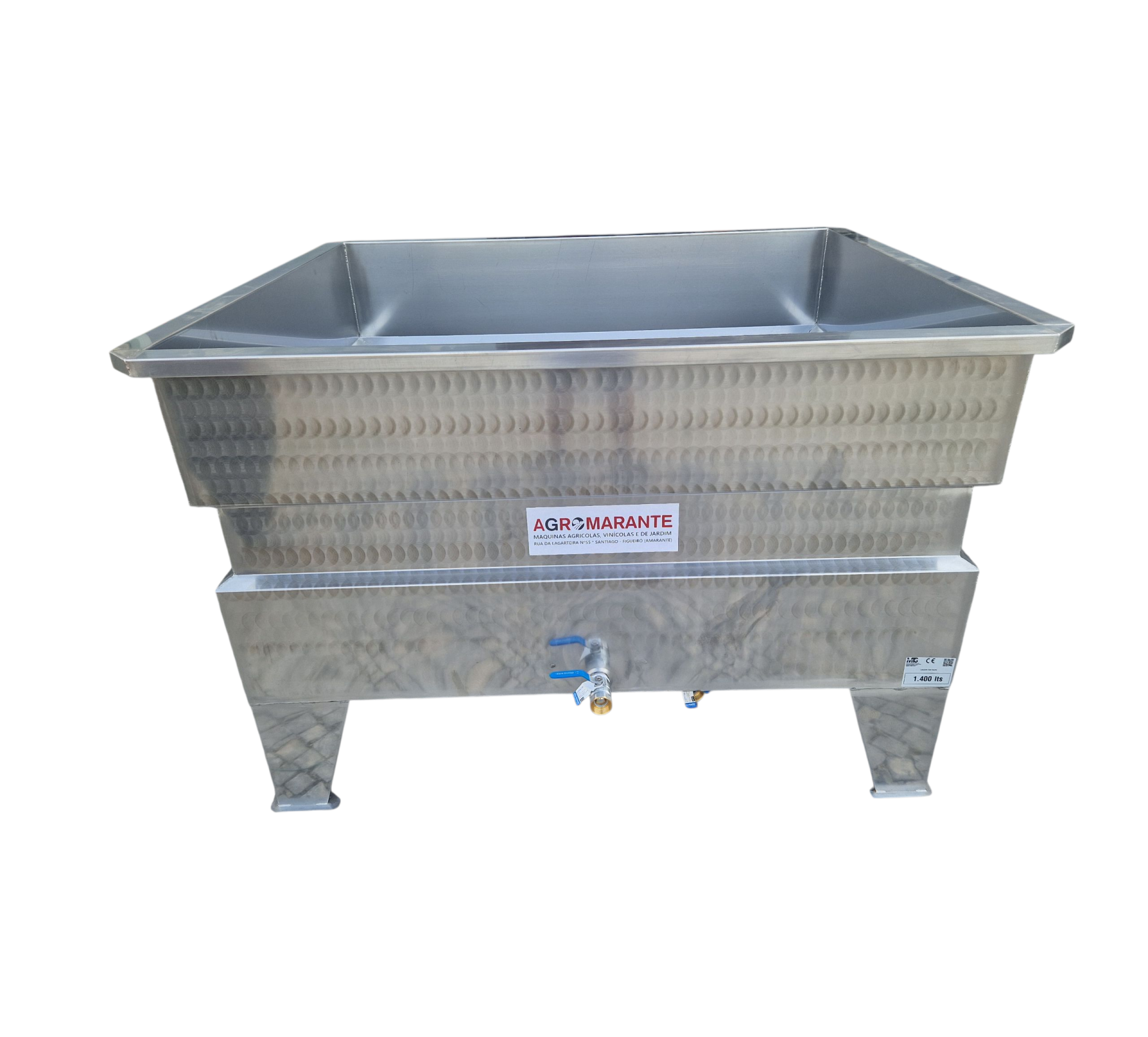 Lagar Inox 1400 Litros 1.000,00 € 1.519,85 € Desconto de %. Partilhar Comprar Contactar Lagar em Inox Inox: AISI304 Capacidade: 1400 Litros Medida Interior: 150x150x60 cm Medida Total: 166x166x90 cm Pernas: 5 Passador Saida: 1 1/4" Passador de Limpeza: 1 1/4" Inclui: Crivo no Fundo Peso: 74 kg Marca MTS Características